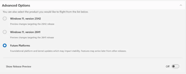 Với người dùng đang ở kênh Canary hiện tại, quá trình chuyển đổi sẽ phức tạp hơn một chút: các bản build dòng 29500 sẽ chuyển sang Experimental (Future Platforms), còn bản build dòng 28000 sẽ chuyển sang Experimental (26H1). Future Platforms là bản xem trước sớm nhất có thể nhận được và không gắn với bất kỳ phiên bản Windows bán lẻ nào.